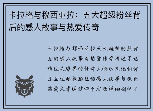 卡拉格与穆西亚拉:五大超级粉丝背后的感人故事与热爱传奇,讲述了这两位足球界的传奇人物以及他们背后五位超级粉丝的感人故事与深刻热爱。文章通过四个方面详细剖析了这些超级粉丝如何支持与崇拜他们的偶像,并通过自己的方式参与、感知、传递这份对足球的无尽热情。从个人情感到社会影响,再到粉丝文化的传承与坚守,每一位粉丝都展现了他们与偶像之间不可割舍的特殊情感。文章最终将这些故事凝聚成一种对足球精神的深刻理解和对偶像的敬仰之情,展示了在体育世界里,粉丝们如何通过对球员的支持与热爱,超越了个人的喜好,成为了一种精神的传承与力量的象征。
